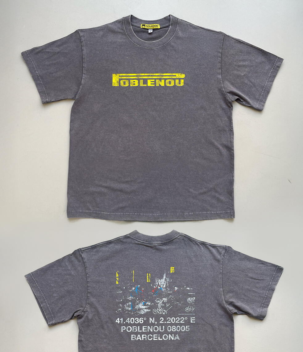 En la parte frontal, el nombre de Poblenou se presenta reinterpretado a través del logo de Pirelli, con efecto vintage que rinde homenaje a la historia industrial del barrio.En la espalda, una fotografía industrial de archivo de los años 50 de Can Saladrigas y las coordenadas del barrio, con acabado craquelado, aporta carácter y autenticidad.Un diseño que fusiona memoria industrial y energía contemporánea, pensado como pieza de colección con espíritu de barrio.